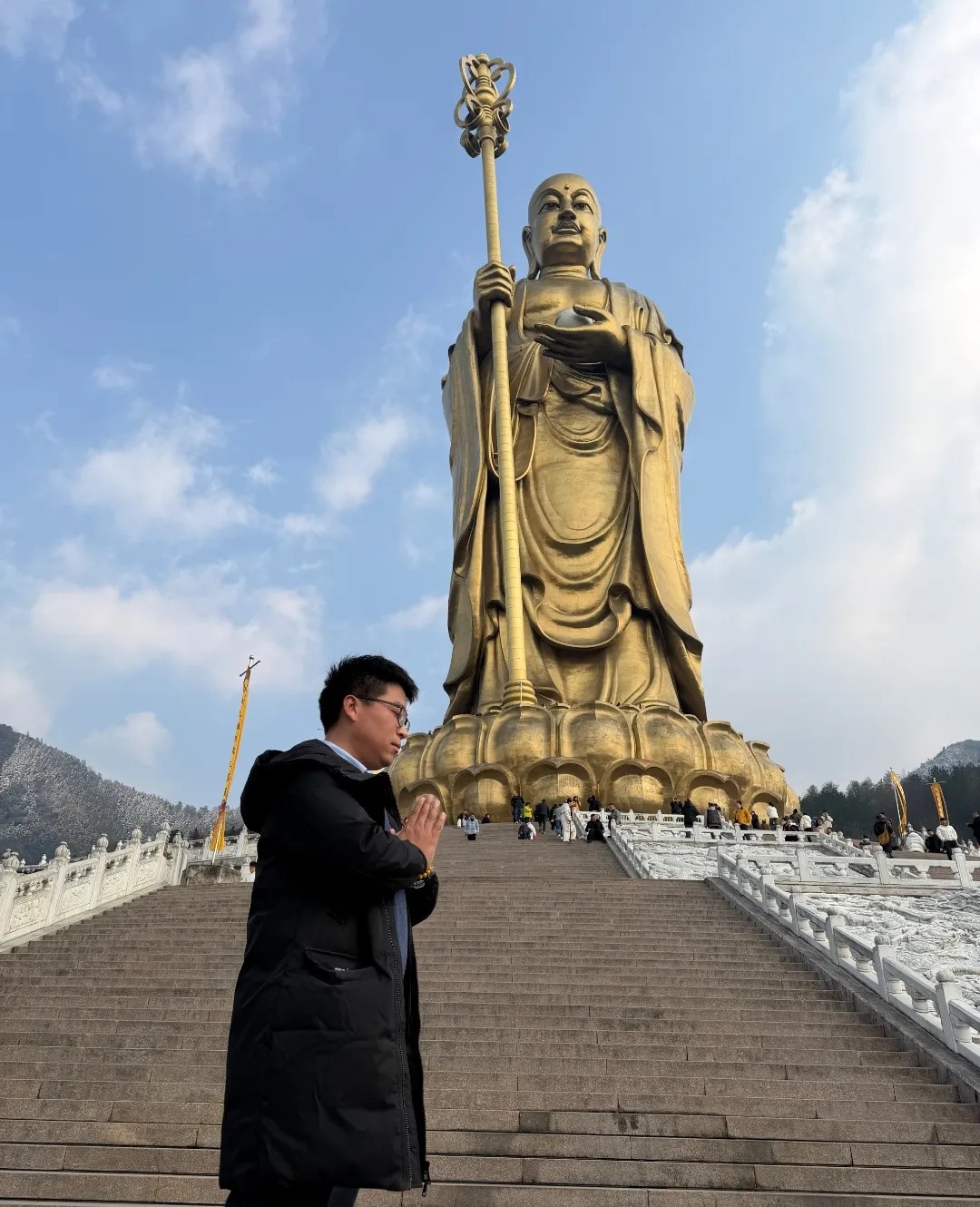我們第一站就打卡了九華山大愿文化園。一踏進園區,莊嚴又治愈的氛圍瞬間包裹全身,巨大的地藏菩薩圣像穩穩矗立在暖陽里,讓人忍不住放慢腳步。